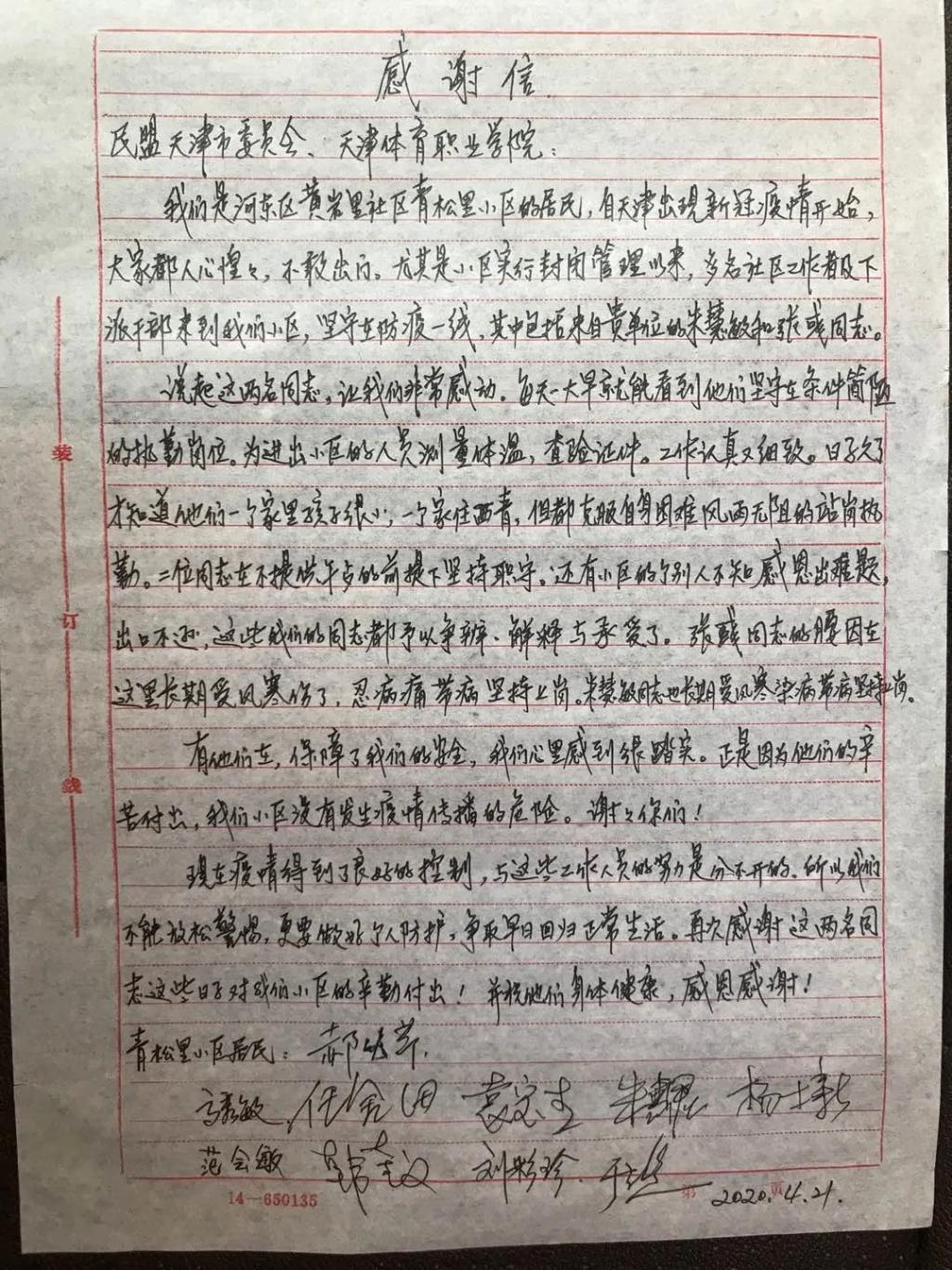 “有他们在,保障了我们的安全,我们心里感到很踏实。正是因为他们的辛苦付出,我们小区没有发生疫情传播的危险,谢谢你们!”4月21日,我院下沉河东区黄岩里社区青松里小区干部张彧收到了一封来自社区居民的感谢信。
