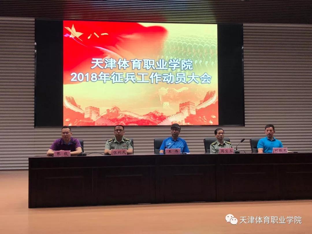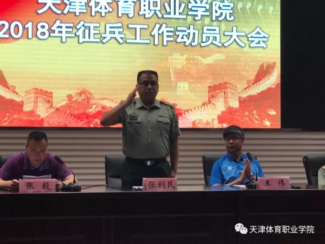 6月22日下午,体职院报告厅召开beat365在线唯一官网2018年大学生征兵工作动员大会。天津市静海区人民武装部部长周宝玉、政委张利民,学院党委书记王伟、院长刘钦龙出席会议,大会由学院副院长张毅主持,学院相关部门负责人、辅导员、全体学生参加大会。