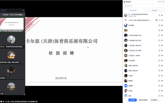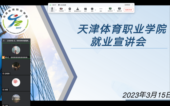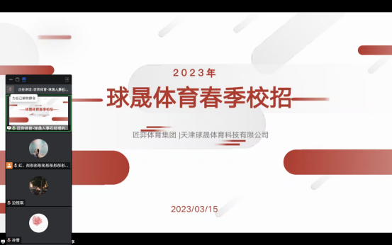 为做好我院2023届毕业生就业服务工作,构建毕业生与企业的交流平台。3月15日上午,我院特邀天津球晟体育科技有限公司、卡尔斯(天津)体育俱乐部有限公司、天津市豪邦篮球俱乐部是三家企业负责人在腾讯会议平台为2023届毕业生进行线上宣讲。