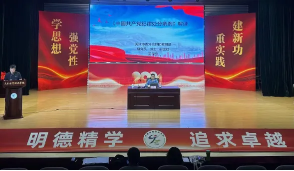 为推进落实中央关于在全党开展党纪学习教育的重大部署,教育引导学院广大党员干部深入学习贯彻《中国共产党纪律处分条例》,始终做到学纪、知纪、明纪、守纪,切实把党纪学习教育成效转化为学院高质量发展成果,结合学院党纪学习教育大讲堂集中学习,体职院邀请市委党校王保彦教授7月11日莅临学院,对《条例》进行权威宣传解读和政策辅导。学院党政主要负责同志、全体党员干部参加了此次培训,党委委员、副院长潘政彬主持会议。