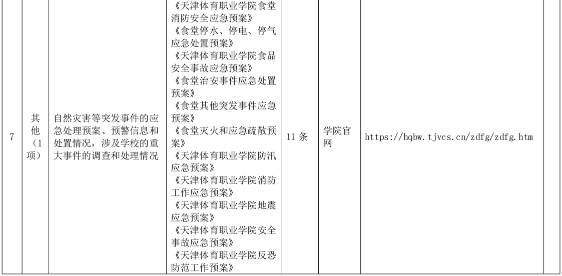 7.公开自然灾害等突发事件的应急处理预案、预警信息和处置情况,包括:《beat365在线唯一官网防汛应急预案》《beat365在线唯一官网地震应急预案》《beat365在线唯一官网安全事故应急预案》《beat365在线唯一官网反恐防范工作预案》《beat365在线唯一官网食堂消防安全应急预案》《食堂停水、停电、停气应急处置预案》《beat365在线唯一官网食品安全事故应急预案》《食堂治安事件应急处置预案》《食堂其他突发事件应急预案》《食堂灭火和应急疏散预案》《beat365在线唯一官网消防工作应急预案》等。